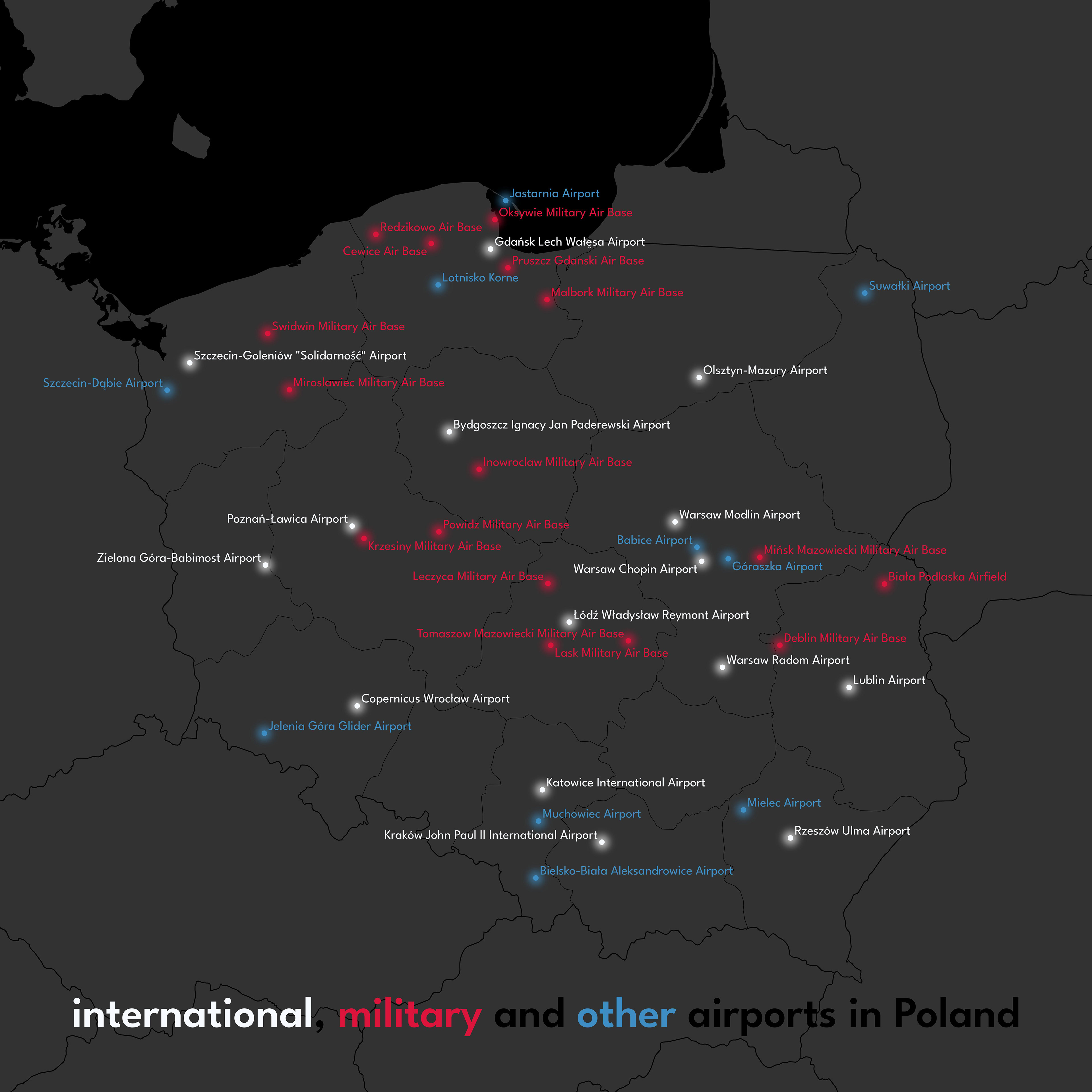, I created a minimalist, clean and visually attractive map of the airports in Poland, color coded by their function.