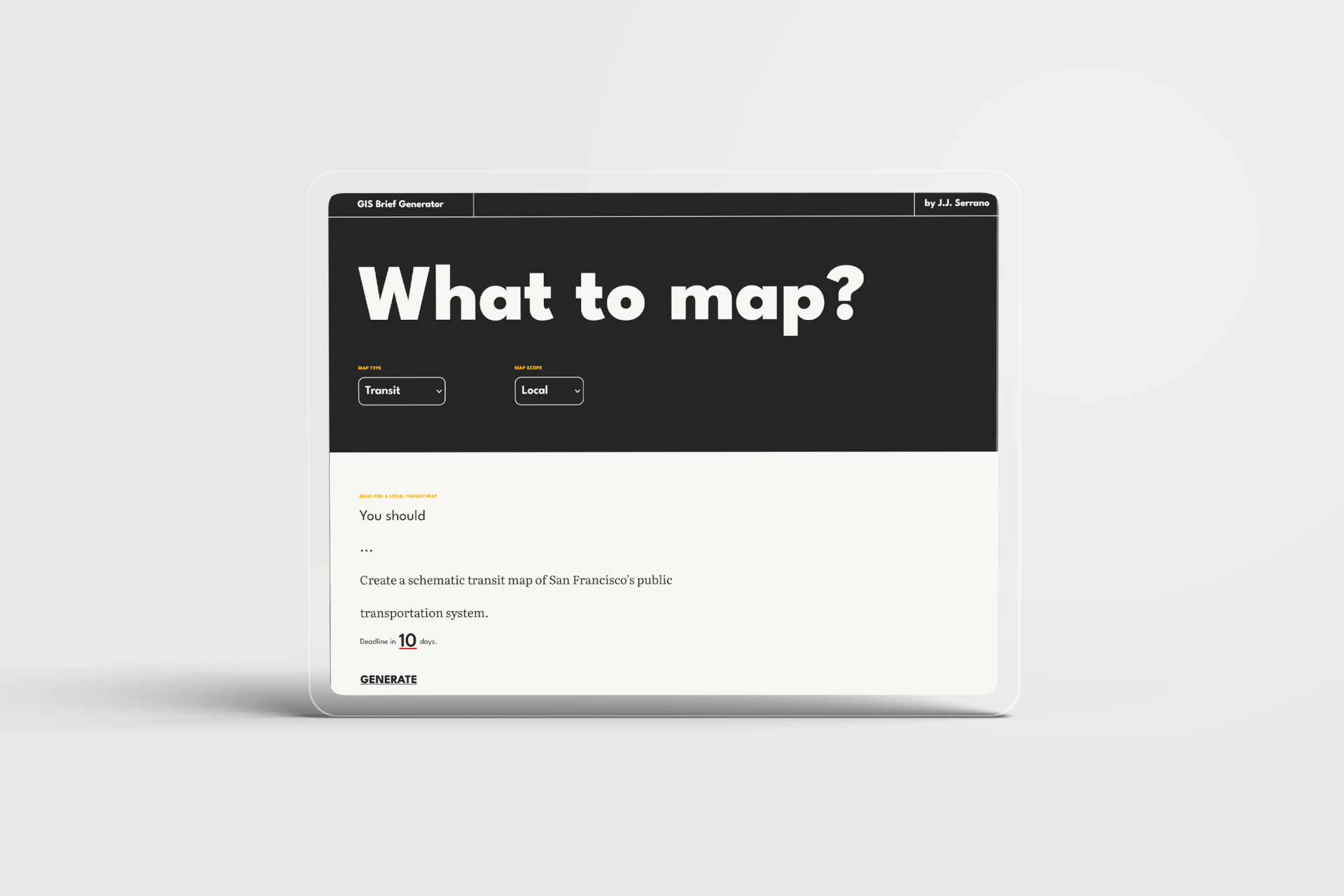 What to map? is a simple React-based web application that allows you to create GIS project briefs. By selecting a map type and a map scope, it will provide you with a random GIS briefing and a deadline.